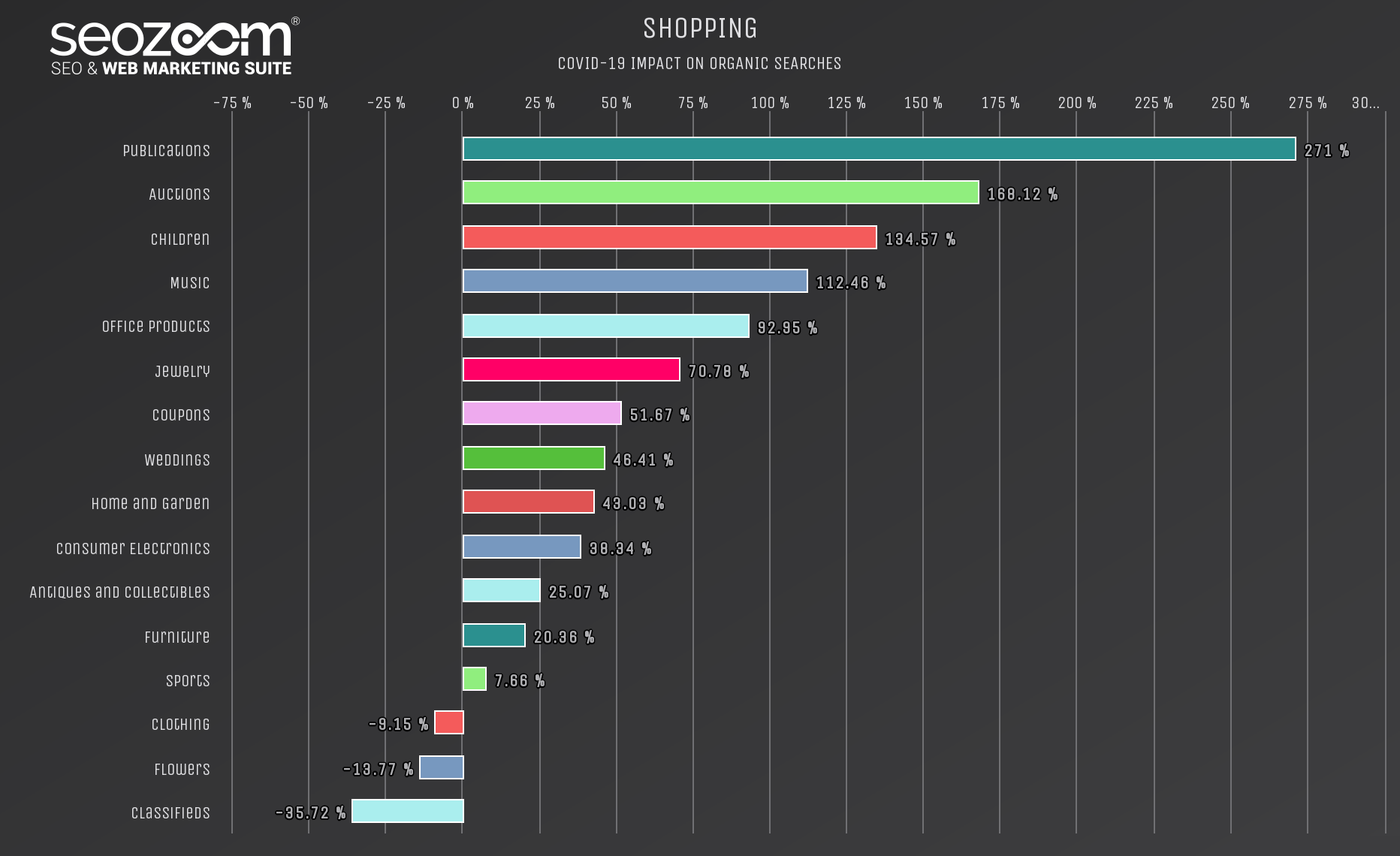 Among the dropping shopping categories we can only find clothing (maybe we do not need them as much now?), flowers and the sale of used products, probably as a further form of social distancing (who wants used products shipped by a stranger, right?).
